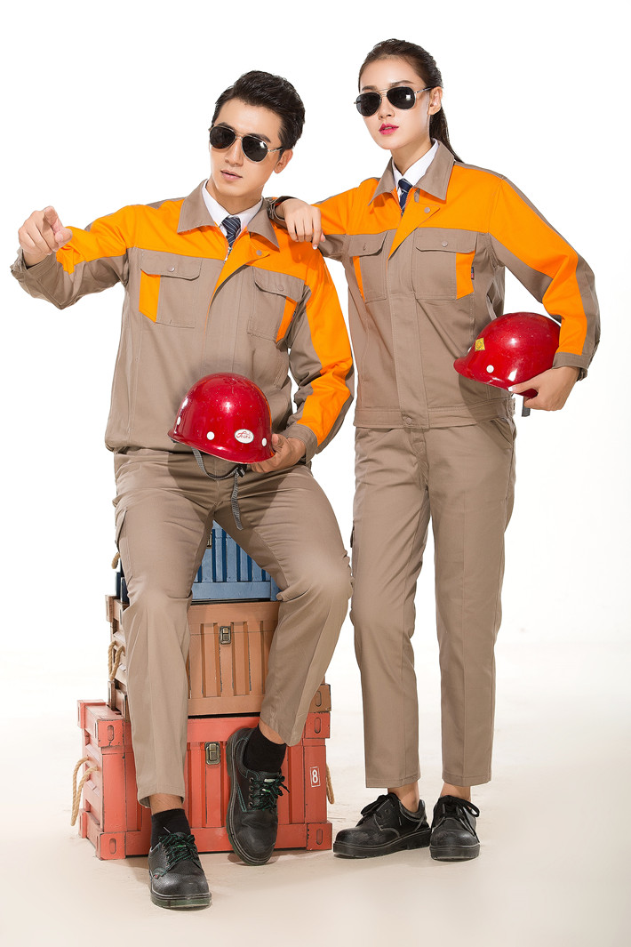 淮南全棉工作服定做款式灰色拼桔黃色長(zhǎng)袖套裝GZ-8017