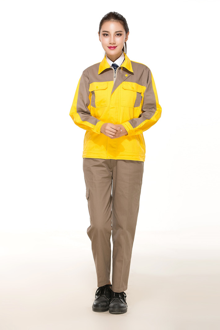 全棉紗卡黃色拼灰色拉鏈?zhǔn)焦ぷ鞣L袖套裝GZ-8018