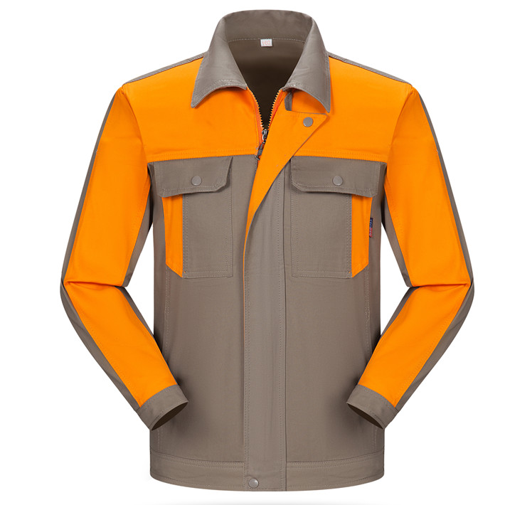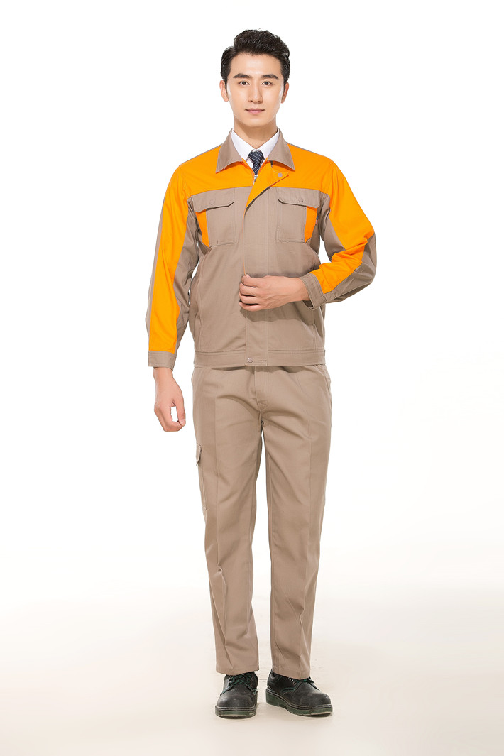 全棉紗卡灰色拼桔黃色拉鏈?zhǔn)焦ぷ鞣L(zhǎng)袖套裝GZ-QM8017