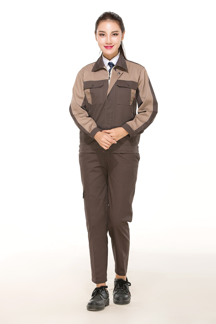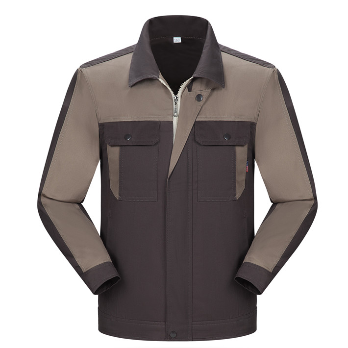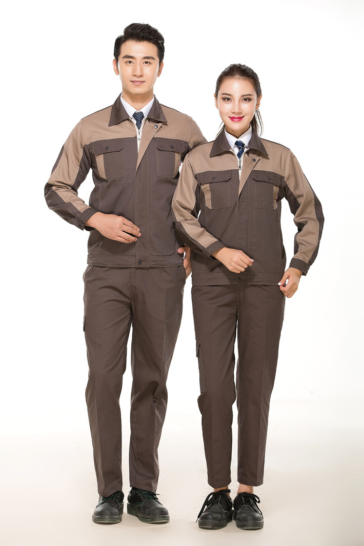 全棉紗卡卡其色拼灰色拉鏈?zhǔn)焦ぷ鞣L袖套裝GZ-QM8023